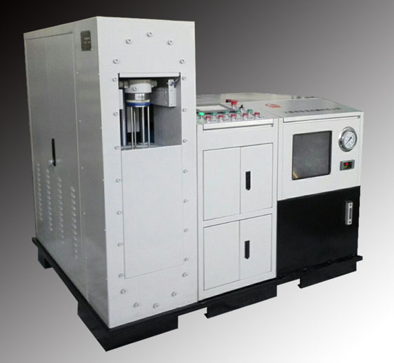 該機(jī)型是將上述幾部分合理組合于一起后外加機(jī)箱罩蓋而成為一體的機(jī)型。擺放在實(shí)驗(yàn)室內(nèi)彰顯整潔美觀和大方。該機(jī)工作腔壓蓋為垂直升降開閉式,其壓蓋內(nèi)設(shè)排氣和應(yīng)急(安全)卸壓裝置;框架固定在底板上,工作缸固定于框架內(nèi)。增壓采用一次增壓完成式增壓器??刂葡到y(tǒng)采用PLC可編程控制器+觸摸屏顯示,可實(shí)現(xiàn)升壓分段自動控制和全程比例自動卸壓等操控形式。